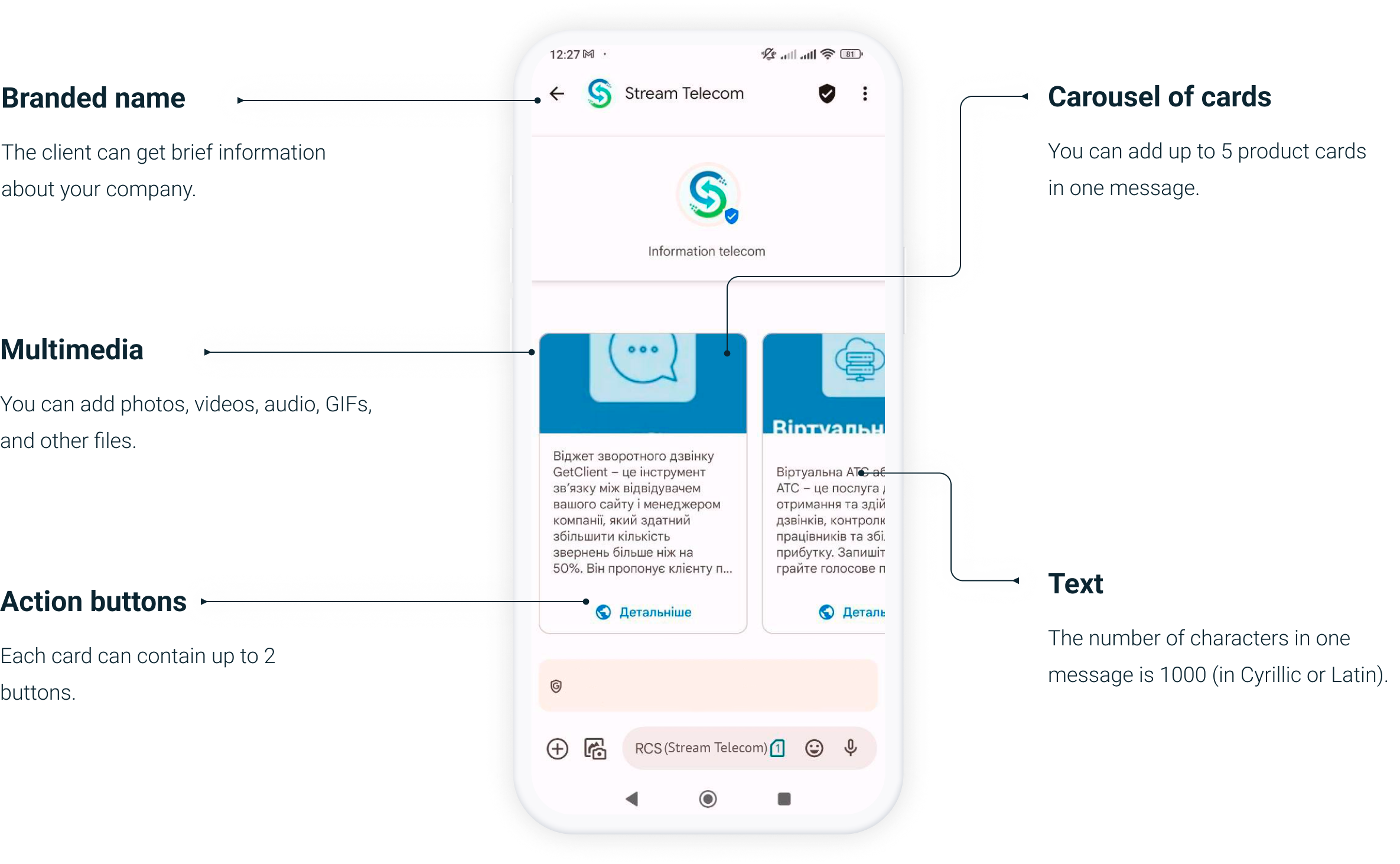 Google has added RCS to the standard Message app on Android, where regular SMS comes in. Your customers don’t need to download the app separately, as with Viber, to receive next-generation messages.