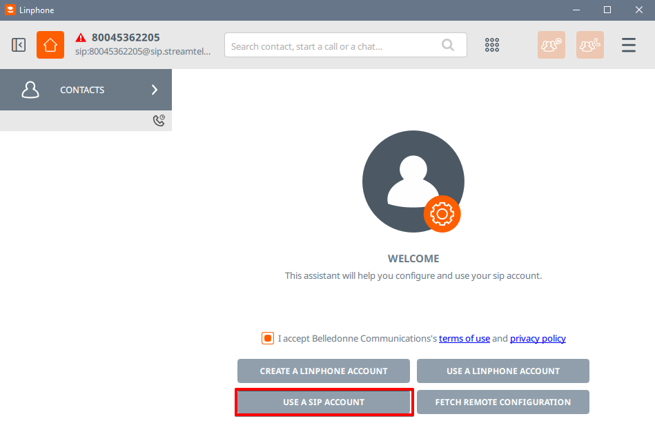After a successful installation, launch PhonerLite. Click “USE A SIP ACCOUNT.”