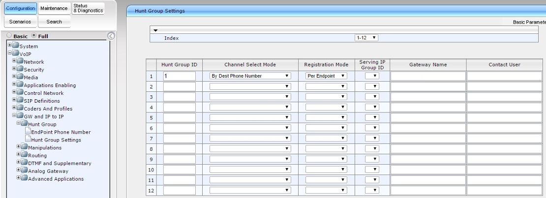 5. Заводим группы для портов. Переходим в VoIP –> GW and IP to IP –> Hunt Group Setting