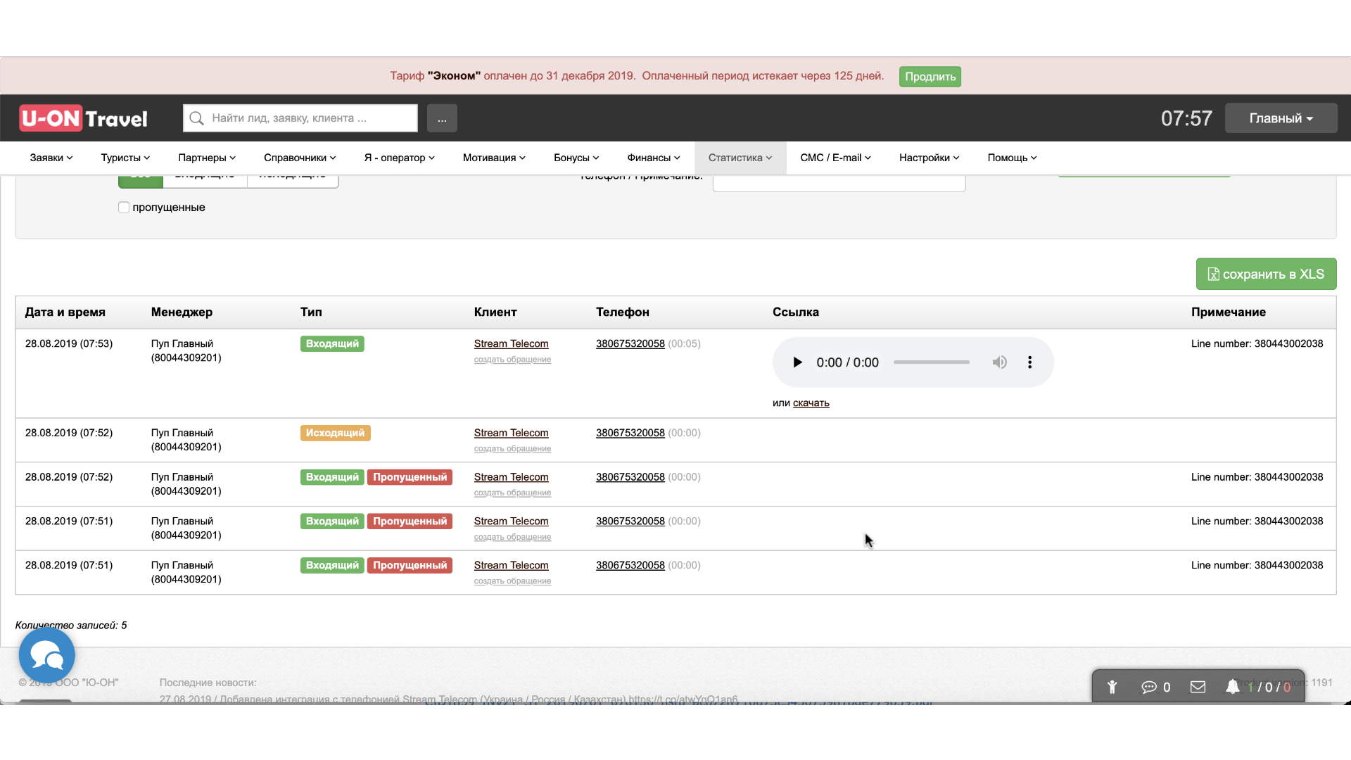 Статистика отображается непосредственно в CRM U-ON Travel, что упрощает работу сотрудников. Теперь нет необходимости использовать личный кабинет телефонии, чтобы посмотреть статистику по звонкам или прослушать разговор.