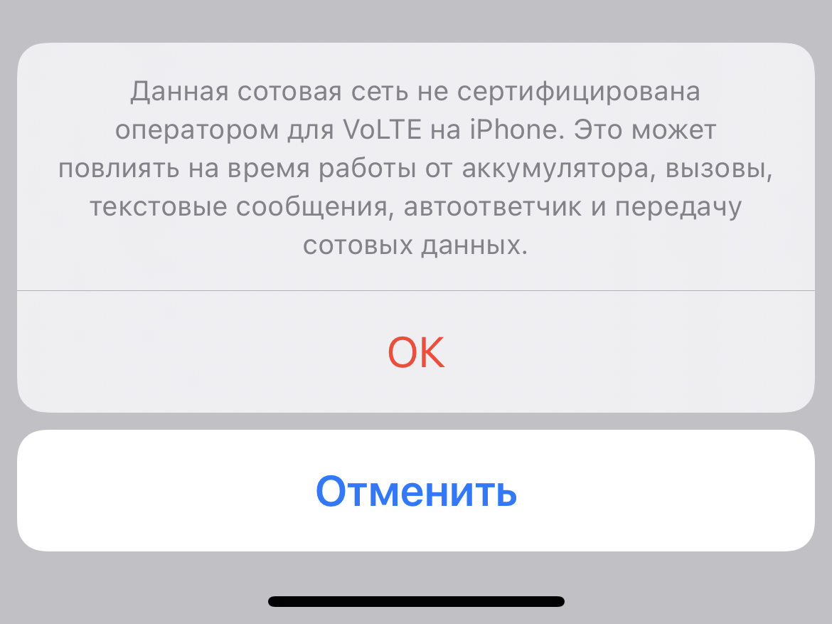 Включение функции VoLTE в сотовой сети, которая не была сертифицирована оператором для использования VoLTE, может повлиять на время работы от аккумулятора, осуществление вызовов, обмен текстовыми и другими сообщениями, работу автоответчика и использование сотовой сети для передачи данных. С данным сообщением соглашаемся. Это означает, что компания Apple еще не внесла все данные по параметрам VoLTE для оператора.