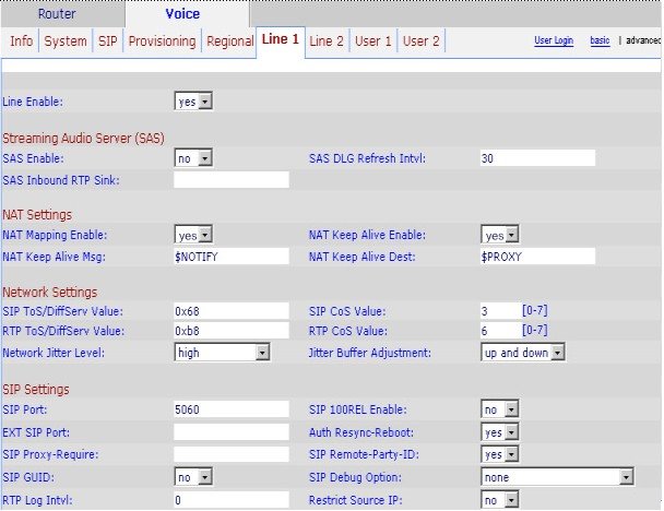 Раздел SIP, впрочем, как и два последующих раздела Provisioning и Regional, содержит специфические настройки, позволяющие произвести тонкую настройку адаптера для работы в различных условиях. Cisco SPA 112 поддерживают два независимых VoIP канала, настройка которых производиться в разделах Line1 и Line2.