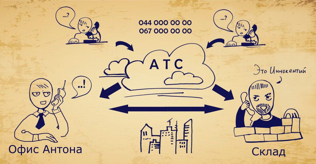 Он зарегистрировал Одесский городской номер, чтобы одесситам было дешевле и приятнее звонить ему.При этом звонки из Киевского офиса могли переадресовываться в Одессу и наоборот. А внутри одной АТС разговоры сотрудников были бесплатны. Вот как все работало: